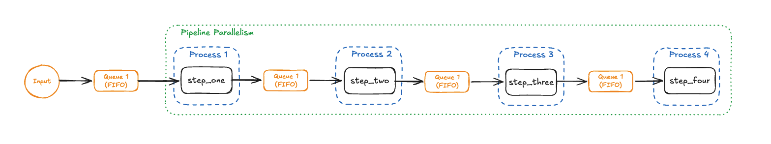 Think of your pipeline as a factory line. Each step runs in its own process and passes data via queues. This means:
